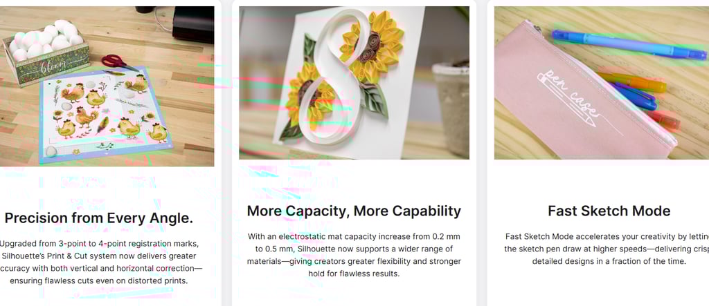 The Silhouette CAMEO5α deliver unmatched precision with cutting speeds up to 400mm/s, balancing efficiency and accuracy for flawless results. A new four-point registration mark system refines Print & Cut workflows with vertical and horizontal correction, ensuring clean, reliable cuts for beginners and professionals alike.